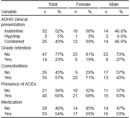 In total, 61 adolescents were surveyed (50.8% women), between 13 and 19 years of age (mean age 15.9 years, SD = 2.061). A total of 52% of the sample had a predominantly inattentive presentation of ADHD and 43% had a combined presentation (Table 1). When dividing the sample by gender, 58% of the female sample had a predominantly inattentive presentation of ADHD and 39% had a combined presentation. In the men sample, 46.6% had a predominantly inattentive presentation, 46.6% a combined presentation, and 6.6% a predominantly hyperactive/impulsive presentation. Most of adolescents did not present a history of grade retention (77%) ( Table 1 ).