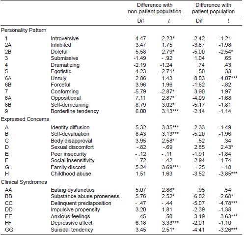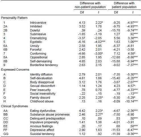 To explore the personality profiles of the adolescents with ADHD, the scores obtained from the sample were compared with those of the reference population. Because MACI standards for Chilean population are differentiated according to gender, the statistical analyses conducted in this study for groups of men and women were considered separately.