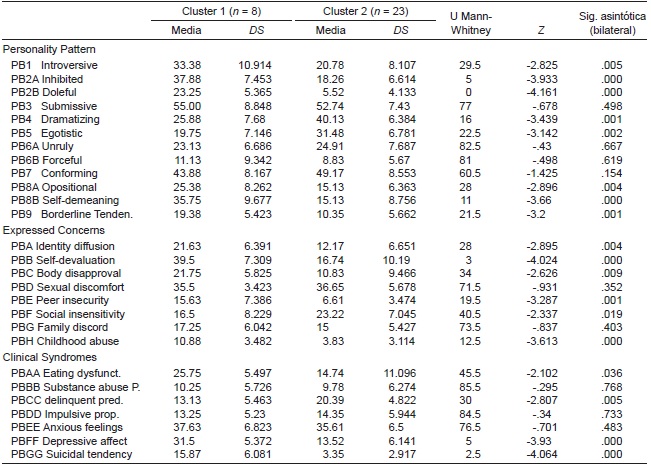 To describe personality sub-profiles within the group studied, the research team performed a hierarchical cluster analysis, which determined that the optimal number of clusters for the sample of adolescents with ADHD was two. A cluster of eight adolescents was configured for the female and male samples (cluster 1). The adolescents belonging to this cluster had higher scores on most of the MACI scales compared to cluster 2 subjects (23 women and 22 men) (Tables 4 and 5).