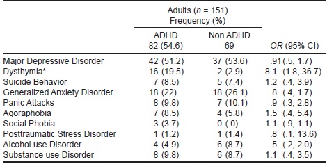 There were no differences in the proportion of women with and without ADHD (70.7% vs. 59.4% respectively, OR = .6; 95% CI[.3, 1.2]; p = .146). The average age in the group with ADHD was significantly lower than that of those who did not present with the diagnosis (28.1 SD 6.1 vs. 31 SD 7, respectively). Within the group with ADHD, 79.3% (n = 65) had at least one comorbid disorder. The average number of comorbid disorders was significantly higher in the group of adults with ADHD compared to the group without the disorder (2.5 SD 1.1 vs. 1.3 SD 1.0 respectively; F = .439; t = -6.621; gl = 149; p < .001). Only dysthymia had a significantly higher frequency in subjects with ADHD compared with those who did not have it (19.5% vs 2.9%, OR = 8.1; 95% CI[1.8, 36.7]) (Table 1).