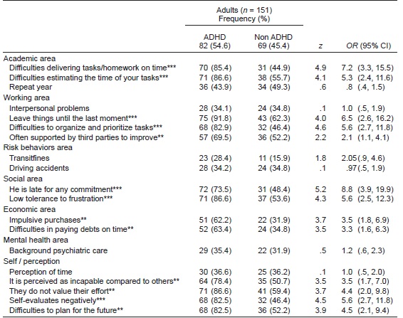 When comparing both groups in the report on difficulties in functioning in different psychosocial spheres (Table 2), we found that adults with ADHD had more difficulties in the workplace. Subjects with ADHD procrastinated more in different activities of their daily lives, had more difficulties organizing their lives and problems managing time and their finances. Finally, in aspects that may affect their performance in daily life, adults with ADHD reported difficulties planning their future and negative self-evaluation more frequently.