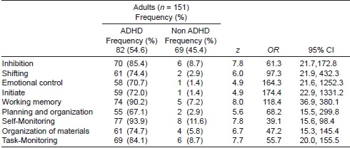 Results: . Individuals in the ADHD group had a higher average of comorbid disorders (2.5 SD 1.1 vs. 1.3 SD 1.0 respectively, F = .439; t = -6.621; df = 149; p < .001), more likelihood of procrastinating (OR = 6.5; 95% CI[2.6, 16.2]; z = 4.0) and were more likely to present difficulties in both the behavior regulation index (OR = 104.9; 95% CI[31.8, 345.7]; z = 7.65) and the metacognitive index (OR = 94.79; 95% CI[29.10, 308.76]; z = 7.56) compared to the non-ADHD group, regardless of gender.