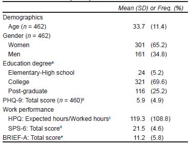 The online survey was designed and implemented using Google Forms. Following guidelines for online research (Regmi, Waithaka, Paudyal, Simkhada, & van Teijlingen, 2016), the link to the survey was originally sent to authors’ acquaintances via social networks (WhatsApp and Facebook), with a brief message encouraging both participation and forwarding of the link and message to other respective acquaintances, independently of participating or not in the study. Once the potential participant opened the link, the informed consent was displayed explaining objectives, activities, voluntary participation, confidentiality, low risk, and possibility of return of individual results (participants who completed evaluation were given the option to provide an individual e-mail, stressing that this will be the only identification data to collect, and a general description of the results, including levels of depression, executive dysfunction, and presenteeism, was sent to them after collection of data). Before beginning with the survey, potential participants were inquired about understanding of informed consent and acceptance of participation; when responding negatively to one of these questions, the survey ended; when not, participants underwent the full evaluation with this sequence: PHQ-9, HPQ, SPS-6, and BRIEF-A.