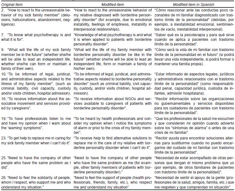 Table 1 presents additional changes to the items agreed by the expert judges. As can be seen, the instrument underwent very few changes, mostly in expressions, adding examples to specify situations in keeping with Mexican Spanish or according to the conditions of family members of patients with BPD (vs. a SMD in general).