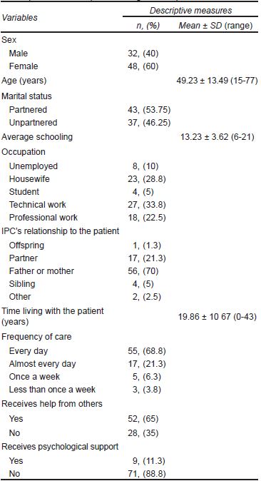 The total sample in this part of the study consisted of 80 IPCs of persons with BPD. We ended up with this sample after the invitation to participate in the study to 95 IPCs of persons with BPD; one of them refused to participate explaining that he did not need any help or service as IPCs, and 14 accepted to participate and initiated the questionnaire, but decided to withdraw from the study arguing that they did not have enough time to complete the questionnaire.