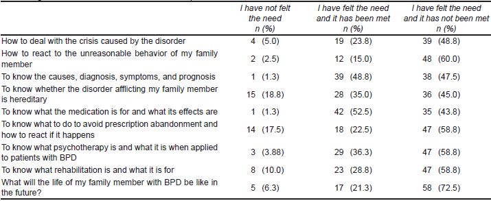 Thus, the data obtained through the present study constitute a first step towards meeting the specific needs felt yet unmet by most IPCs of patients with BPD, including more specific psychoeducation objectives and therapeutic strategies for the development of emotional and cognitive skills.