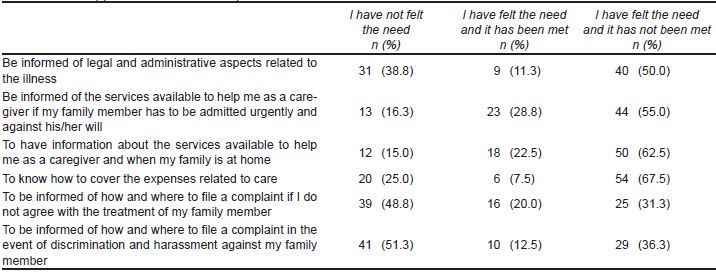 Results: Cronbach’s alpha coefficients for different groups of needs evaluated through the instrument were: Knowledge/information = .77, Instrumental support = . 78, Participation = .63, and Personal support = .74; and for the total score = .86. The most important unmet felt needs were: 1. having information on interventions for patients and caregivers, legal and administrative aspects, and available support services; 2. having coping skills to deal with crises and manage patients’ risk behaviors; 3. receiving professional care to reduce stress; and 4. being listened by health professionals, express their personal opinions, and need for rest.