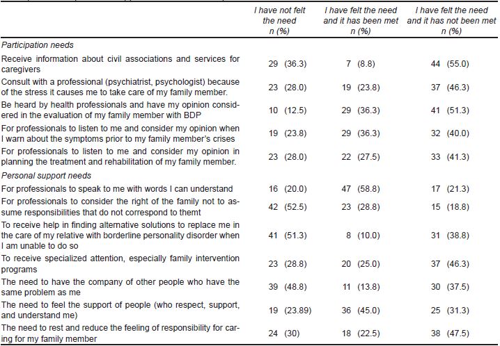 Table 5 shows the results about Participation and personal needs. Regarding Participation, the most frequent unmet needs included: receiving information about support groups and services for caregivers (55%); being listened to by health professionals to give their opinions as caregivers during the evaluation of the family member with BPD (51.3%); and consulting with a professional (psychiatrist, psychologist) because of the stress of taking care of a relative with BPD (46.3%).