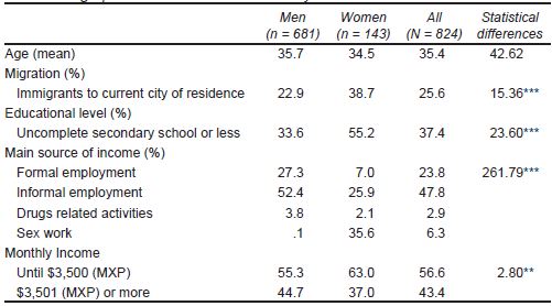 There were 824 PWID surveyed, among which 74.0% were men and 26.0% were women. The sociodemographic profile of participants shows conditions of greater vulnerability for women in terms of migration, schooling, occupation, and income compared to men (Table 1). While almost 39% of the women reported being migrant to the current city of residence, the proportion was about 23% among men (p < .001). Most women reported a schooling attainment lower than completed secondary, while the proportion among men was almost 34% (p < .001). Women also reported much lower access to formal employment than men (7.0% vs. 27.3%, p < .001), even though Hermosillo and Ciudad Juárez have an important presence of maquilas, which hired mainly women. This could express that these women face an especially difficult situation to get incorporated into the local labor markets. Consequently, sex work appears as an important source of income for women but not for men (35.6% vs. 0.15%, p < .001); however, their income level is lower than the one reported by men (p < .05).