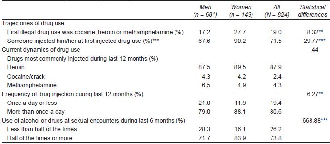 We found no differences on the type of drugs participants injected during last 12 months by sex, though women reported a slightly higher frequency of injection, which posit them in higher risk of blood infections and vein collapses (Table 2). On the other hand, women also reported a higher frequency of alcohol and drug use during their sexual encounters.