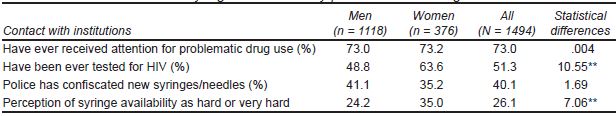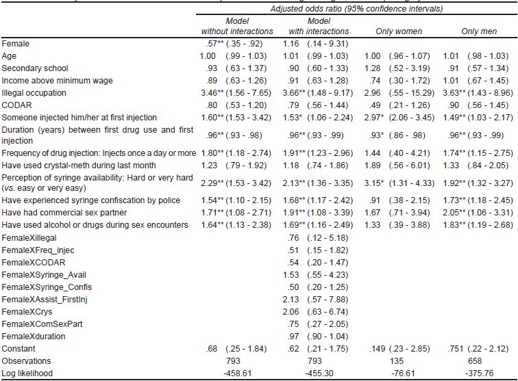 These descriptive findings suggest that men and women face differential structural characteristics and distinct barriers to access health care services. Therefore, it is possible to think that predictors for receptive needle sharing have differential effects and weights on men and women.