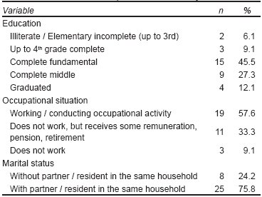 A total of 33 caregivers (parents or grandparents) of children, aged between 6 to 12 years old (M = 8.3, SD = 1.86); 69.7% were boys and 30.3% were girls; 78.8% frequented school. The most frequent diagnoses were: attention deficit hyperactivity disorder (39.4%), and autism spectrum disorder (39.4%), followed by oppositional defiant disorder (12.1%), and schizophrenia (12.1%). Psychiatric comorbidities were present in 24.2% of the patients. In relation to other caregiver information, Table 1 presents such results.