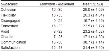 The results of family functioning (FACES IV) indicated that 12.1% (4) of the families were dysfunctional. The mean balanced cohesion score was higher than the flexibility score, and in the unbalanced subscales the highest means were observed for the enmeshed (excessive approximation between members with little opportunity for privacy) and the rigid (strict adherence to norms and rigidly defined functions) features (Table 2).