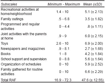 The correlation results are presented in Table 4. The subscales of recreational activities at home/neighborhood, programmed and regular activities, school support, and supervision did not correlate with family functioning. The strongest correlation detected was family cohesion and family gathered for routine activities (r = .515). The scales associated with family dysfunction (disengaged, enmeshed, and chaotic) always showed negative correlations with the availability of resources in the environment. Rigidity of family norms and rules was not correlated with the topics investigated by the RAF (Table 4).