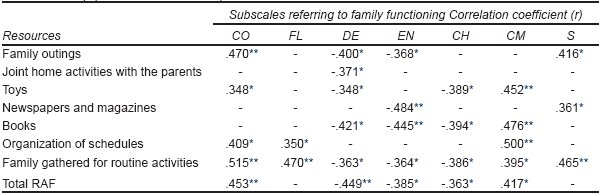 Regarding the associations between family functioning and the resources of the family environment, the dimensions favorable to family functioning such as cohesion and communication showed positive associations with different family resources, in agreement with the results of a study on children with cerebral palsy conducted with similar objectives (Morilla et al., 2017). Conversely, the unbalanced cohesion extremes (related to the disengaged and enmeshed subscales) showed negative correlations with family resources.
