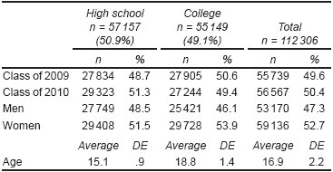 This paper presents an analysis of data obtained from two censuses (2009 and 2010). The censuses were carried out with high school and undergraduate freshmen students in a public university from Mexico City. This work included 116 214 students; 112 306 (96.6%) completed the information for the CES-D scale and for the other psychosocial indicators (violence, family relationship, and history of illness and alcoholism); 53 170 (47.3%) of the participants were men and 59 136 (52.6%), women (Table 1); the age ranged from 14 to 24 years old ( X̄ = 16.9 ± 2.2). The majority lived in homes with between one and four members (55.4%); 86.0% reported that their fathers worked and 59.4% that their mothers did; 79.7% lived with both parents and 17.9% with only their mother.