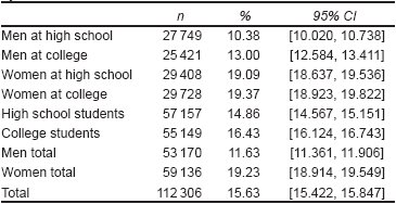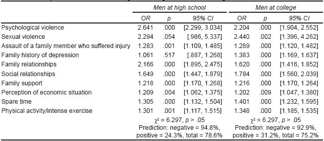 The prevalence of depressive disorder was 16% in this population. Men at college presented a higher prevalence of depressive disorder than those at high school; in the case of women there were no differences based on educational level. However, at both educational levels, women presented significantly higher prevalence than men (Table 2).
