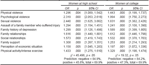 The logistic regression analyses showed a similarity in the predictors of depressive disorder for men and women of both educational levels. The common predictors in the four groups were as follows: having suffered psychological or sexual violence, having a family member who had been injured during an assault, history of depression in the family, poor family relationship, and social relationships, perception of economic situation (ranging from average to bad), little support from the family, and lack of physical activity or intense exercise (Tables 3 and 4).