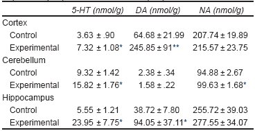 Table 1 shows the total concentration of 5-HT, DA, and NA in the cortex, cerebellum, and hippocampus of the control and experimental groups. A significant increase of 5-HT (p < .05) and a highly significant increase of DA (p < .001) were present in the cortex comparing control and experimental groups. No significant differences were found in NA.