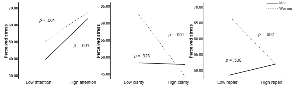 To examine the influence of sex and the sub-factors of the PEI on perceived stress, we conducted moderation analyses to tests whether sex moderated the effect of sub-factors of the PEI on perceived stress. In the first step, age and sex were entered as covariables. The sub-factors of the PEI were entered in the second step. At last, the sub-factors of the PEI x sex interactions were included in the third step. For predicting perceived stress, a total of 11% of the variance was explained by final model (Table 4). The sex x repair interaction explained a significant amount of the variance in perceived stress. We used Dawson (2014) to graphically represent the moderating effects. As shown in Figure 1, there are significant differences in the scores of perceived stress for individuals with low and high attention in both sexes, while the differences for clarity are only significant for women, the same as for regulation scores. In men, no significant differences were found in the scores on perceived stress, differentiating for low and high clarity and regulation.