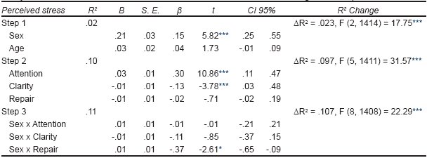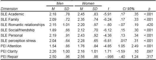 According to the scientific literature on stress and emotional skills, we expect to find results that indicate a greater perception of stress in women, and a greater attention to their feelings, whereas men are expected to present higher scores in clarity and emotional repair. It is also expected to find differences between both sexes in the relationships between emotional abilities and the perception of stress of different stressful events. Finally, we expected that PEI components moderate the association between SLE and perceived stress.