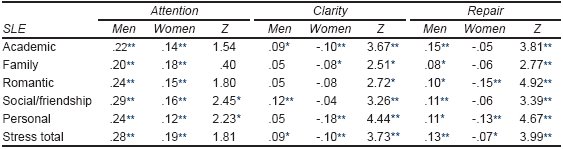 In turn, men display low emotional attention and average scores in clarity and emotional repair, aspects that, although they denote adequate PEI, should be examined in detail in future studies, because it has been documented that men self-report a perceived emotional intelligence superior to that shown in execution tests (Gartzia, Aritzeta, Balluerka, & Barberá, 2012; Sánchez-Nunez et al., 2008). It is noteworthy, however, that findings indicate low-moderation magnitude correlations but significant with SLE subscales: therefore, these results must be taken into consideration appropriately.