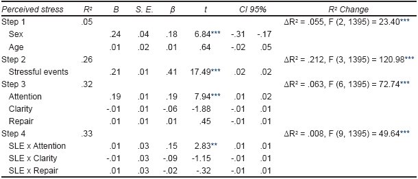 In order to know the role of PEI in the relationship between the number of SLE and the level of stress perceived by the SLE, a moderation analysis was carried out. Age and sex were included as covariates in step one, the number of SLE were introduced in step two and the sub-factors of PEI were included in step three. Finally, the interactions between the number of SLE and the sub-factors of the PEI step four were included.