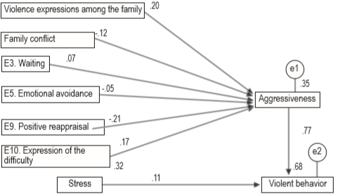 According to the exposed model, the variables “average of expressions of intrafamily violence”, “family conflict”, “stress” and coping strategies “waiting”, “emotional avoidance”, “lack of positive reappraisal”, and “difficulty expressions” explain the variance of violence by 68%; the adjustment indicators (p = .05, NFI > .95, CFI > .95, RMSEA < .08, and ratio of chi square/degrees of freedom it is between 2.0 - 3.0) are optimal, except for the TLI index which was a little bit under the required score (.934), but could be considered as a well-adjusted level based on the degrees of freedom, without overparameterization of the model.