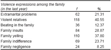 A significant percentage of people related that in their family there was at least one participant who behaved in a violent manner in their daily lives, an aspect that may be associated with the fact of social legitimacy that has been given to violence as an appropriate way to solve conflicts (Nascimento et al., 2009; Lee et al., 2014).