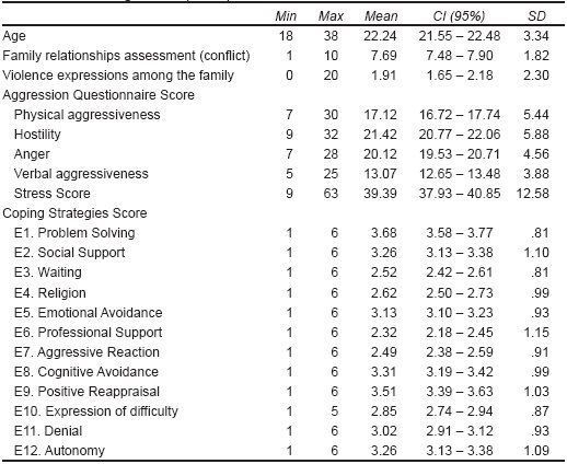 On the other hand, the sample was heterogeneous in terms of the scores obtained in the dimensions that make up the violence questionnaire, so there were extreme scores. These scores indicated that the sample there were people without any reference of aggressive reactions, but there were also others that showed high levels to be classified as aggressive ones. Also, there were people from the sample with extremely high and extremely low levels of stress. An analogous situation is documented for the stress scale. Likewise, it was found that the most recurrent coping strategies are based on problem solving, social support, emotional avoidance, cognitive avoidance, positive reappraisal and autonomy, while the least used are waiting, religion, professional support, and aggressive reaction (Table 2).