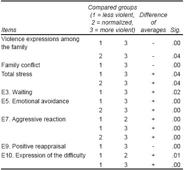 Additionally, the level of aggressiveness was grouped or classified into three different levels (high, medium, and low) considering as a criterion the standard deviation, and according to this an analysis of variance (ANOVA) was applied, determining differences in the averages of the evaluations to the violence expressions among the family, family conflict, total stress, waiting, emotional avoidance, cognitive reappraisal, and expression of coping difficulties (Table 3).