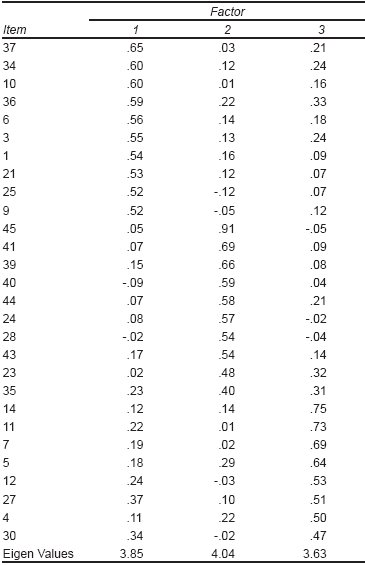 The following items were eliminated: factor one 37, 34, 25, 21, 9, and 1, factor two 44, 43, 41, 35, 28, and 23, factor three 27, 14, 7, 5, and 4.