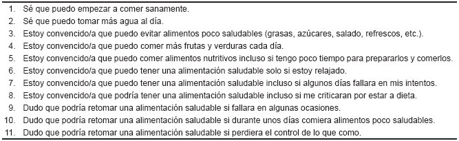 Measuring self-efficacy in the population with obesity poses a challenge for research. The development of this scale was based on the need to measure self-efficacy as regards diet in a population with obesity. Schwarzer’s Self-efficacy Scale for Nutrition (Schwarzer & Renner, 2005), which we used as a base, contains five items. We consider that we could cover other aspects of self-efficacy by increasing the number of items for each dimension of the construct. These include the perception of support from one’s partner or family, criticism for being on a diet, the time and money spent preparing food, frustration in response to unsuccessful attempts, and being able to resist non-nutritious foods in poorly-controlled environments such as parties, etc.