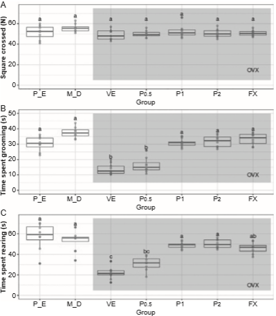 In the present study, no significant changes in spontaneous locomotor activity were observed, indicating that the effects of progesterone and fluoxetine in the forced swim test were not attributable to spontaneous motor effects and thus likely associated with a positive motivational state that resulted from the antidepressant-like effect of the neurosteroid. Additionally, rearing and grooming are behavioral indicators of emotional states in rats when they are exposed to novel environments (Gilad, Rabey, Eliyayev, & Gilad, 2000). The rats at eight weeks post-OVX had the lowest level of rearing and grooming in the open field test, which could be associated with a depression-like state that was previously reported in ovariectomized rats (Rodríguez-Landa, Rodríguez-Santiago, Rovirosa-Hernández, García-Orduña, & Carro-Juárez, 2014; Rodríguez-Landa et al., 2017). This suggests low motivation to auto-groom and explore, which is commonly observed in rats that exhibit “anxiety” or “despair” (Rodríguez-Landa et al., 2009b; Contreras et al., 2011; Puga-Olguín et al., 2019). These changes in grooming and rearing behavior associated with ltOVX were prevented by progesterone and fluoxetine, reaching values that were similar to rats in P-E. Therefore, alterations of grooming and rearing that were associated with progesterone and fluoxetine treatment could be a behavioral component of the antidepressant-like effect that was detected in the forced swim test.