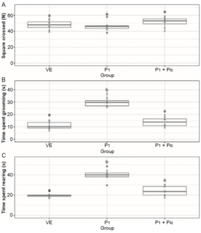 At the onset of the test, the rat was gently placed in one of the corners of the cage, and the following variables were measured: number of squares crossed (a square crossing was recorded when the rat passed from one square to another with its hind legs), time spent rearing (rearing was recorded when the rat acquired a vertical posture relative to the cage floor; this behavior is considered an indicator of exploration that is lower in animals that exhibit “stress” or “despair”), and time spent grooming (i.e., paw licking, nose/face grooming, head washing, body grooming/scratching, leg licking, and tail/genital grooming). Grooming is considered an indicator of stress in rodents (Kalueff & Tuohimaa, 2005). This behavior is lower in rats that exhibit “stress” or “despair” and recovered by antidepressant drug and neurosteroid treatment (e.g., progesterone and allopregnanolone; Contreras, Rodríguez-Landa, Bernal-Morales, Gutiérrez-García, & Saavedra, 2011).