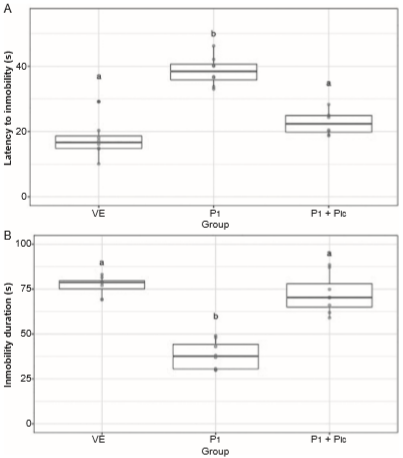 The latency to the first episode of immobility was significantly different between groups (H2 = 17.565, p < .001). The progesterone-treated group exhibited a longer latency to the first episode of immobility compared with the vehicle-treated group, and this effect was prevented by pretreatment with picrotoxin (Figure 4A). The progesterone-treated group exhibited a lower total immobility time compared with the vehicle-treated group (H2 = 15.860, p < .001), and this effect on immobility was blocked by picrotoxin (Figure 4B).