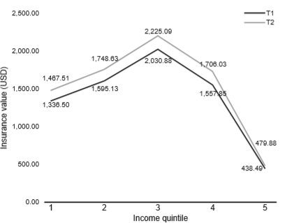 The value of the annual assurance at the population level is US $ 7,627.14 for T2 and US $ 6,958.86 for T1. This valuation is not homogeneous among the quintiles, since quintile III is the one which is most willing to pay for insurance with respect to the other quintiles. On the other hand, in the highest income quintile, the minimum assurance valuation was observed. In the case of T3, it was found that this option is highly expensive, with a monthly treatment cost seven times higher than the other two options (Table 2). In turn, T3 is not available for all the quintiles because the insurance cost exceeds the income. In fact, for quintile I the treatment cost is 50% higher than the income and for this reason, it was not possible to estimate the insurance value, since the term (y-c) must be positive. Figure 1 shows the insurance value for the five quintiles of the two most cost-effective treatments.