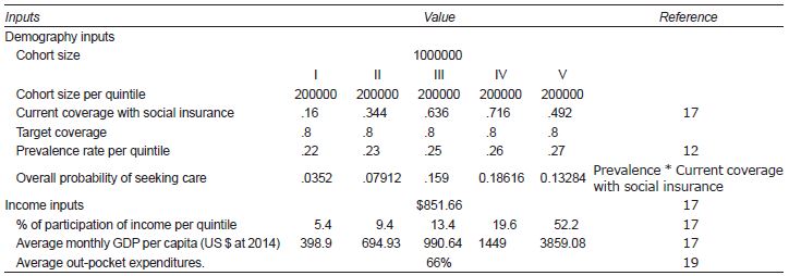 We consider that the population with Social Security has access to medicines and psychosocial care in the first and second level of medical care, which is concordant with the prevalence of coverage for low incidence mental disorders (Whiteford et al., 2013). For the present study, it is considered that in the highest income quintiles the prevalence is higher, given that they have better access and use of health care services, so that the probability of seeking care results from the product of the prevalence and the percentage of coverage in each quintile. The out-of-pocket expenditure for care medical is 66% of the monthly income (Wirtz, Santa-Ana-Tellez, Servan-Mori, & Avila-Burgos, 2012).