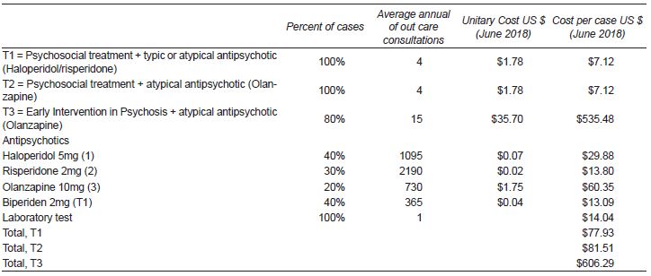 Considering a population of one million people, a prevalence of 2 200 cases of schizophrenia is estimated. It is assumed that 80% of the population would be covered with UPF, that is, 1 760 cases.