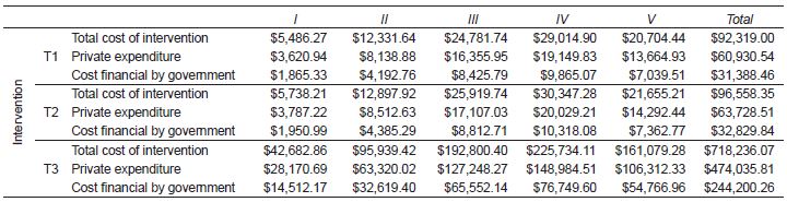 In the current situation, the cost of intervention financed by the government to the population with social security is up to 80% higher for the quintiles with higher income compared to the poorest quintile. In the present analysis, the out-of-pocket expense for the cost of intervention and the prevalence of the disease by income quintile ranged from US $ 60,930.00 to US $ 474,035.43 (Table 4).