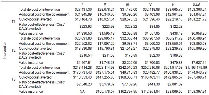 The cost per capita of implementing each intervention, as the quantity of the total cost and the hypothetical population, is US $ 0.15, US $ 0.16 and US $ 1.19 for T1, T2 and T3 respectively. This means that T1 and T2 are highly affordable and low cost, while option T3 is possibly affordable, according to the criteria to identify investment priorities in mental health (World Health Organization, 2013).