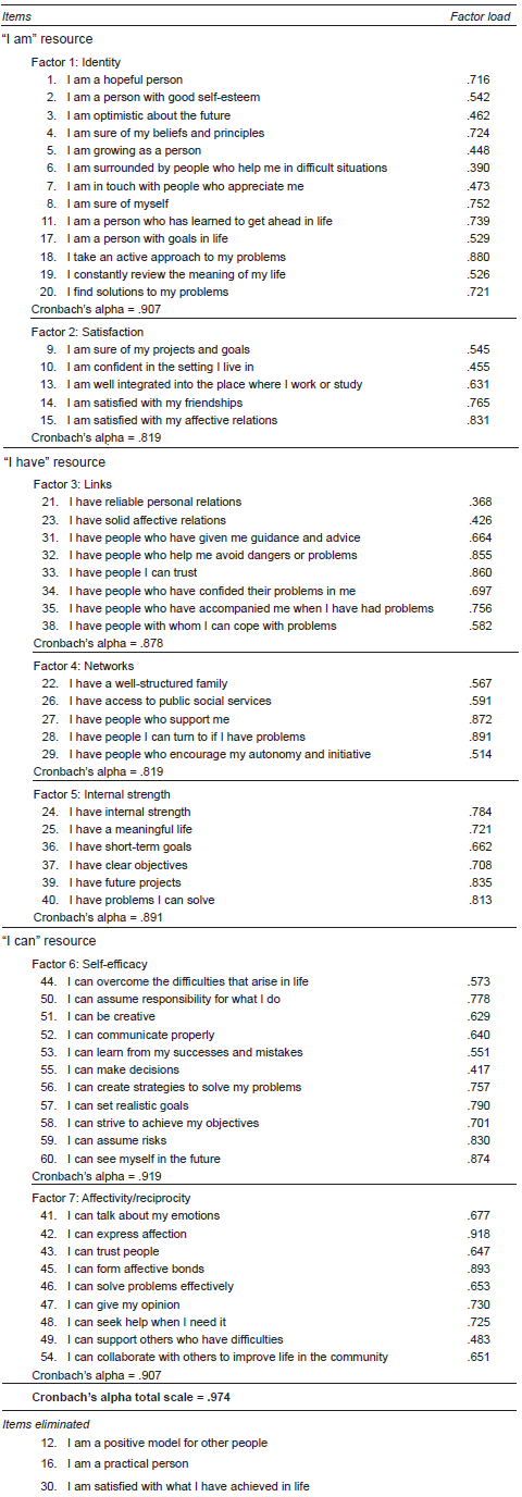 For the “I have” resource, three factors were identified that explained 61.54% of the variance; item 30 was eliminated because it loaded on all three factors. Factor 3 was called “Bonds,” factor 4 was termed “Networks,” and factor 5 was designated “Internal strength.”