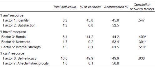 Factor analysis of the resilience scale was carried out using the method of extracting principal components through oblique rotation. See, Table 1 below for the items comprising each of the three resources with their respective factor loads and internal consistencies.