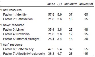 Results: The scale presented overall internal consistency (Cronbach’s alpha of .974), with seven dimensions (identity, satisfaction, links, networks, internal strength, self-efficacy, and affectivity/reciprocity) that accounted for 72.75% of the variance.