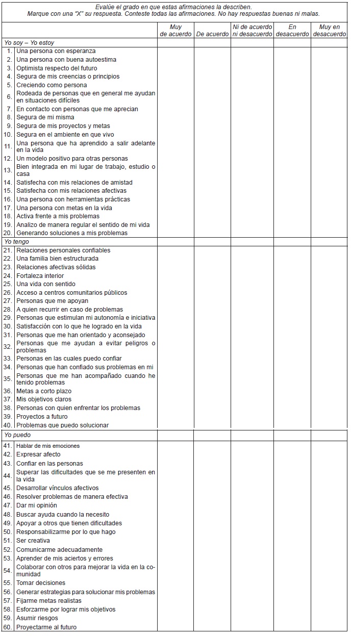 It is a self-applicable scale with 60 items divided into three resources “I am,” “I have,” and “I can,” which in turn form 12 specific resilience factors: identity, autonomy, satisfaction, pragmatism, links, networks, models, goals, affectivity, self-efficacy, learning, and generativity. The questionnaire has Likert-type response options, ranging from 1 - “strongly disagree” to 5 - “strongly agree,” yielding a minimum score of 60 and a maximum of 300 for the total scale. The highest score reflects greater skills or resilient characteristics. The validity study carried out by the authors showed a concurrent r = .76 and reliability measured through the Cronbach’s alpha of .96 (Saavedra & Villalta, 2008a).