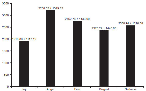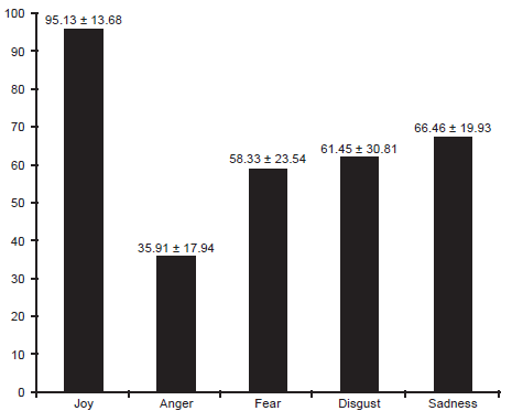 The percentage of recognition of the five emotions (joy, sadness, fear, anger, and disgust) evaluated with ERI showed that joy was the only emotion recognized over 90% of the time by the subjects, while the least frequently recognized emotion was anger (Figure 1).