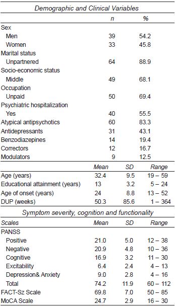 Seventy-two patients with schizophrenia with an average age of 32.4 years were included. Just over 50% were men and over 60% were unemployed. The age of onset of the disorder reported was 24 years, with an average duration of untreated psychosis (DUP) of nearly one year (50 weeks). All patients were under treatment with antipsychotics at the time of the study.