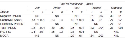 Three significant associations were found: between anger recognition and the severity of the PANSS cognitive subscale (r = -.24, p = .03); between sadness recognition and the severity of the PANSS negative subscale (r = -.24, p = .03); and between the FACT-Sz score and fear recognition (r = .31, p = .008). Associations were also found between the time for emotion recognition and symptom severity at the time of the study. The PANSS subscales of positive symptoms and anxiety/depression symptoms showed no correlations with the time for emotion recognition, while the subscale of cognitive symptoms and overall severity (total PANSS) showed associations with the time for recognition of all emotions (Table 2).