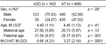 The mean age of the children with ASD (M = 4.40 SD ± 1.11) was slightly lower, but not statistically significant compared to the mean age of the children diagnosed with ASD (M = 4.48 SD ± 1.13) (Table 1). The proportion of males/females in children diagnosed with ASD was higher than those children with NT, being this relationship of three boys to one girl in the children diagnosed with ASD.