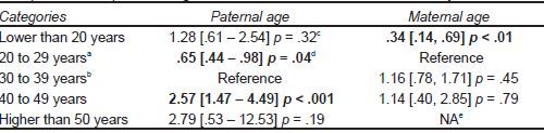In the second model, we also measured the association between the maternal or paternal age and the ASD case status, but in this analysis we categorized the individuals based in the conception maternal and paternal age. Five categories: lower than 20, 20 to 29, 30 to 39, 40 to 49, and higher than 50. In all the models, the OR and CI 95% was calculated, the category where the mean, median, and mode overall sample, parental age was used as the reference category.